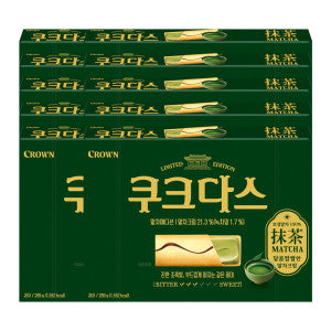 A premium Korean soft, thin, and delicate sandwich biscuit, featuring a slightly bitter matcha cream filling. This 289g package contains roughly 34 individual cookies, popular for pairing with tea or coffee.